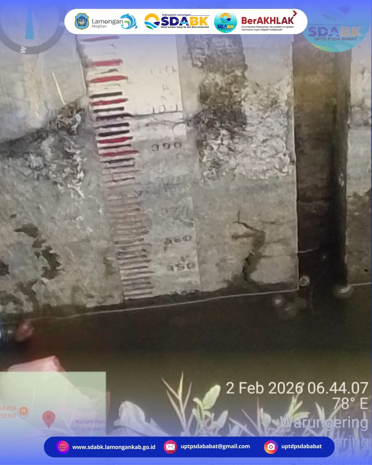 UPTD Pengelolaan Sumber Daya Air Babat melaksanakan kegiatan monitoring kondisi debit air Waduk Kalen di Kecamatan Kedungpring pada Senin, 02 Februari 2026.