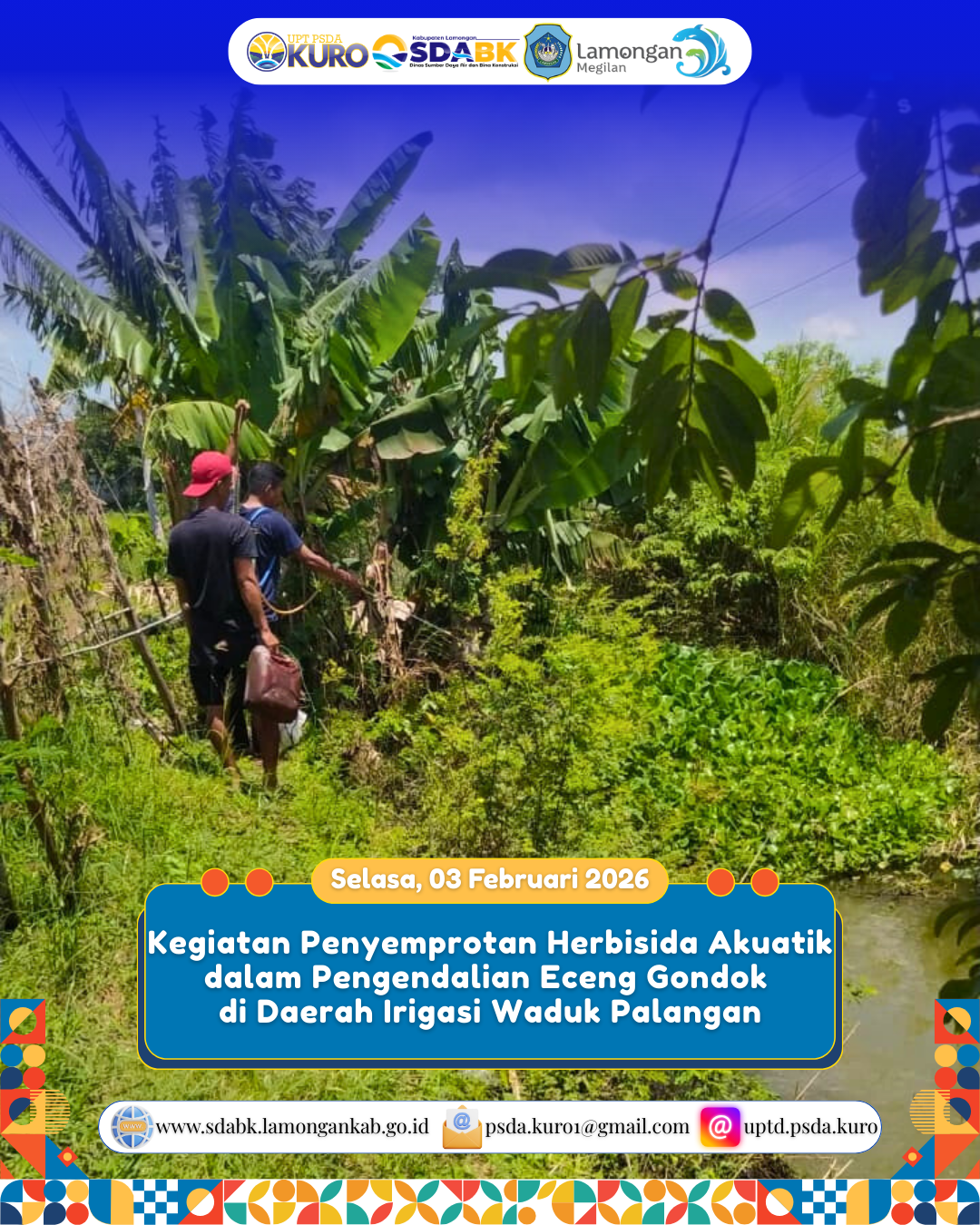 UPTD PSDA Kuro melaksanakan kegiatan penyemprotan herbisida akuatik di Daerah Irigasi Waduk Palangan sebagai upaya pengendalian pertumbuhan eceng gondok yang berpotensi menghambat aliran air. Kegiatan ini dilakukan secara terarah dan terukur guna menjaga kelancaran distribusi air pada jaringan irigasi.