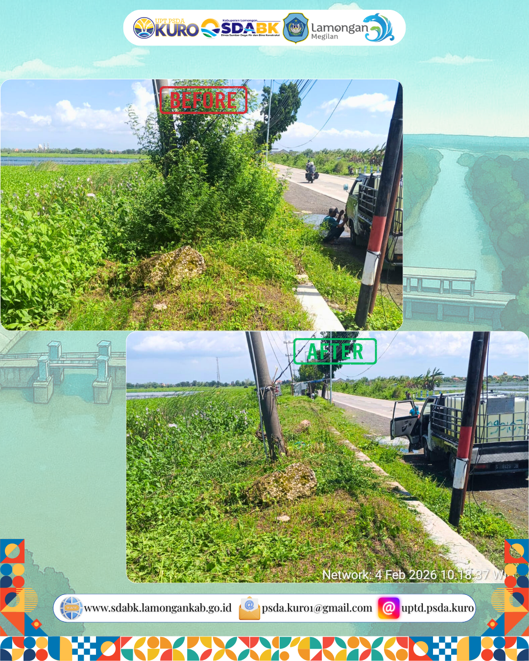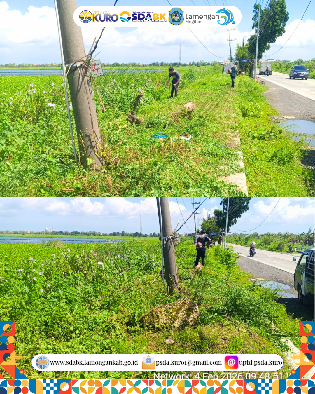 UPTD PSDA Kuro melaksanakan kegiatan pemeliharaan rutin berupa pembersihan rumput di sekitar tanggul sisi timur Daerah Irigasi Rawa Sebanget. Kegiatan ini dilakukan untuk menjaga kondisi tanggul tetap terawat, mencegah kerusakan akibat pertumbuhan vegetasi liar, serta memastikan area tanggul berfungsi optimal dalam mendukung pengelolaan air.