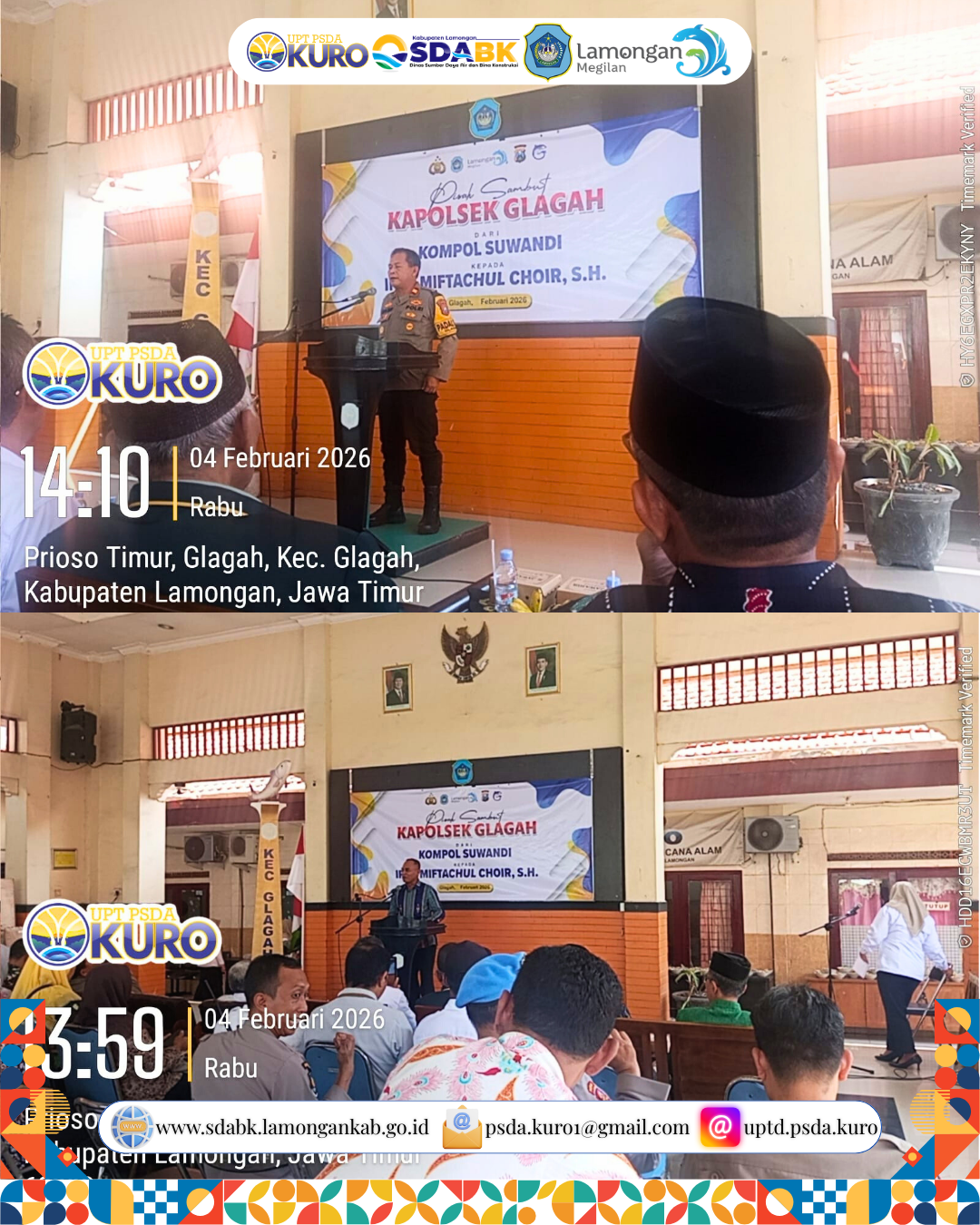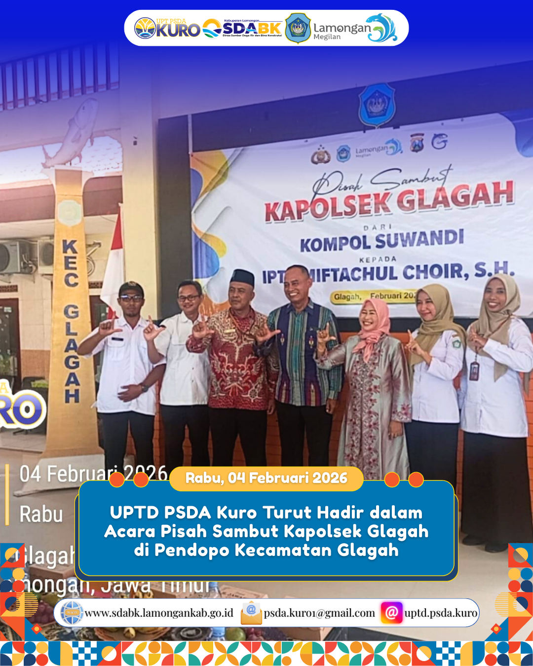 UPTD PSDA Kuro turut hadir dalam kegiatan pisah sambut Kapolsek Glagah yang diselenggarakan di Pendopo Kecamatan Glagah. Kehadiran ini merupakan bentuk dukungan dan sinergi antar instansi dalam menjaga koordinasi serta komunikasi yang baik demi kelancaran pelaksanaan tugas di wilayah Kecamatan Glagah.
