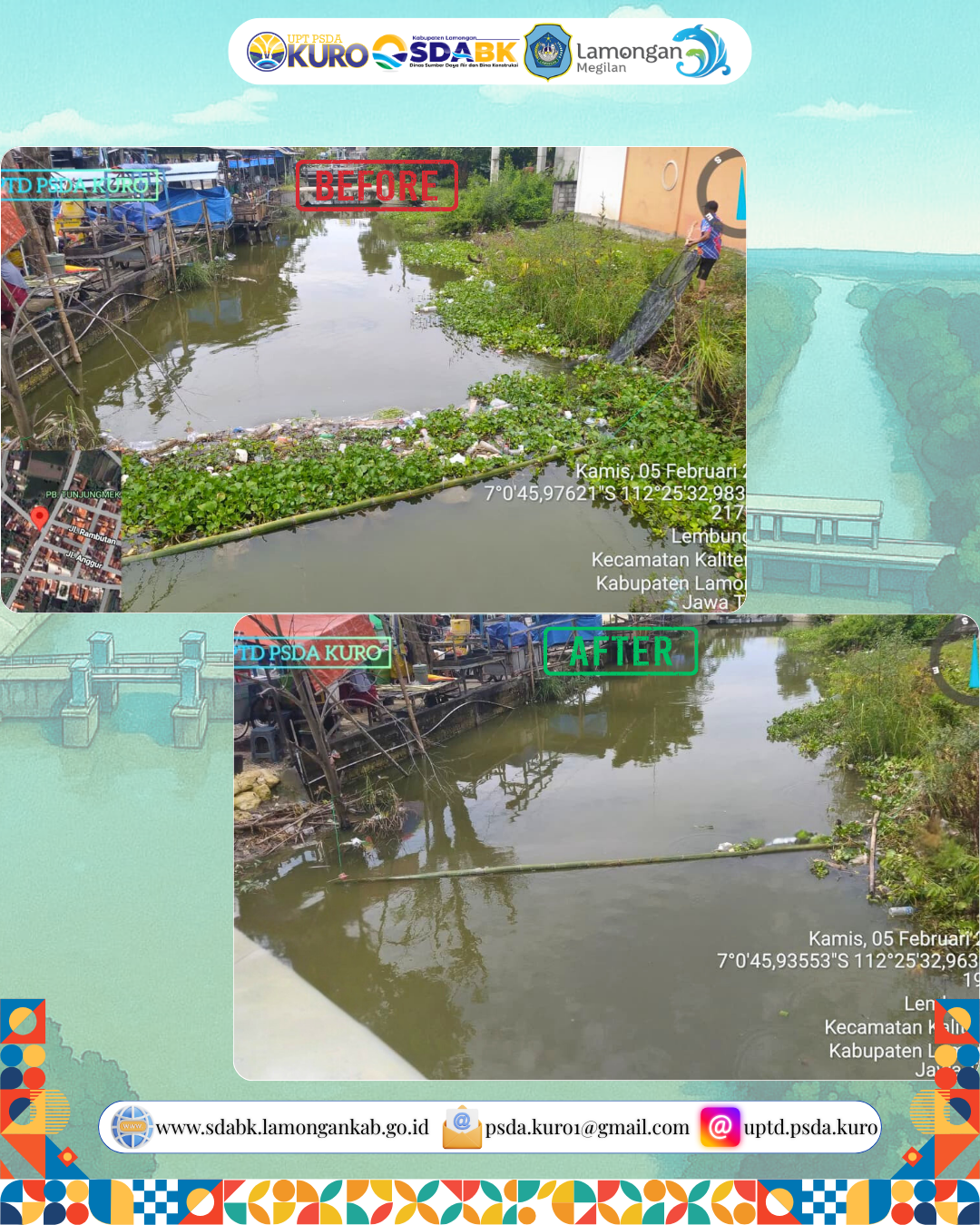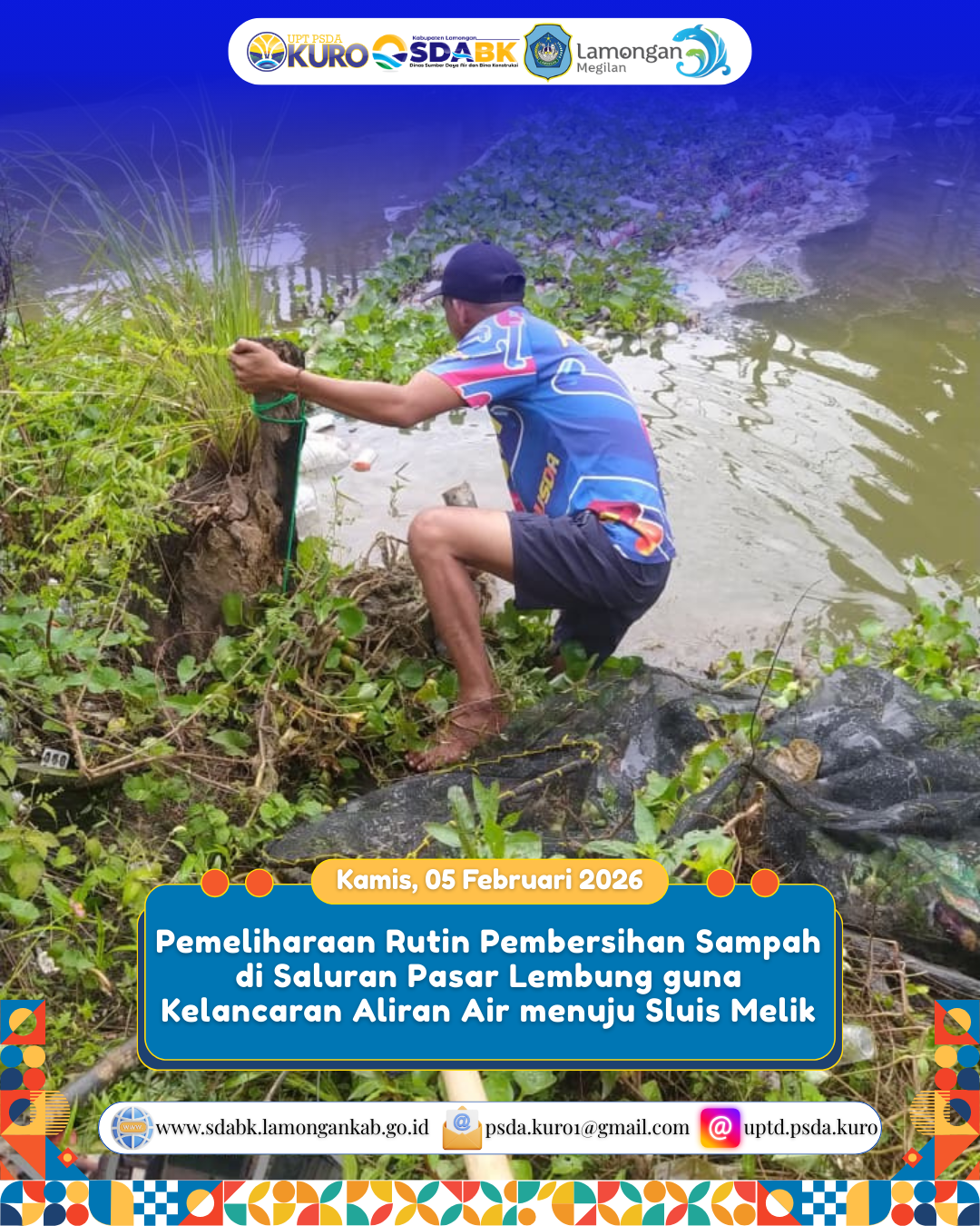 UPTD PSDA Kuro melaksanakan kegiatan pemeliharaan rutin berupa pembersihan sampah di saluran Pasar Lembung. Kegiatan ini dilakukan untuk menjaga kelancaran aliran air menuju Sluis Melik serta mencegah terjadinya penyumbatan yang dapat menghambat sistem pembuangan air.