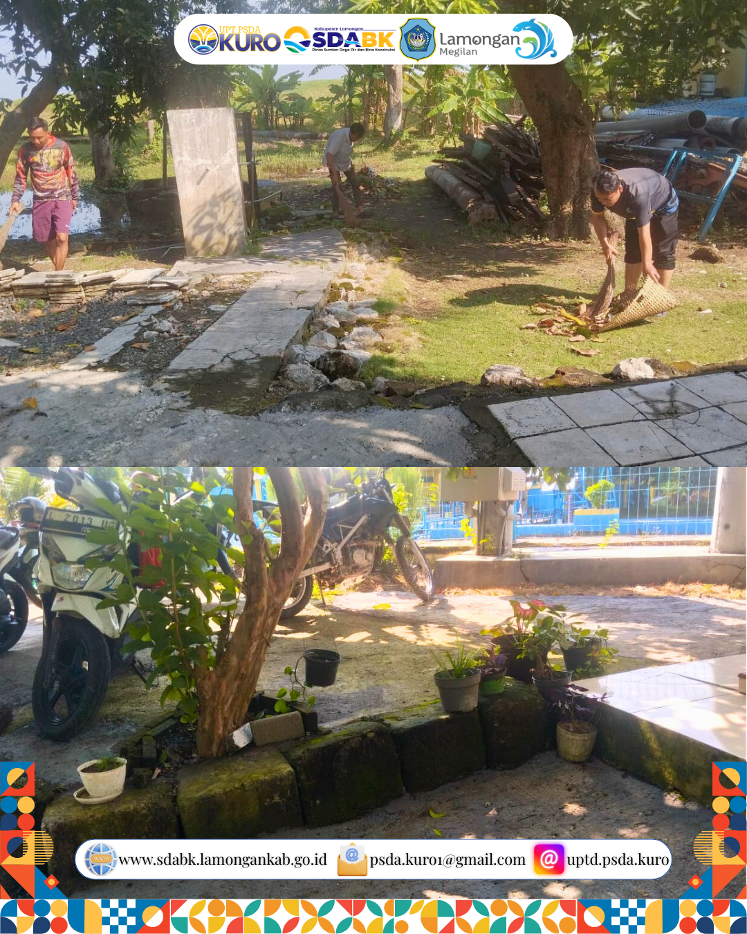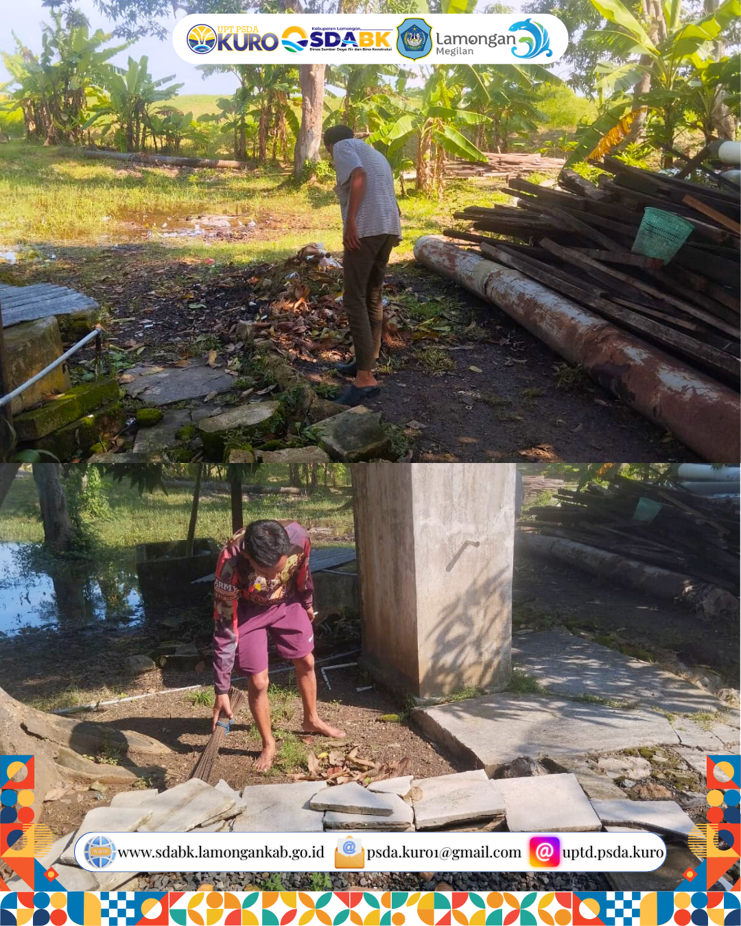 UPTD PSDA Kuro melaksanakan kegiatan kerja bakti rutin Jum’at Bersih di lingkungan kantor sebagai upaya menjaga kebersihan, kerapian, dan kenyamanan area kerja. Kegiatan ini dilakukan bersama seluruh pegawai guna menciptakan lingkungan kantor yang sehat dan tertata dengan baik.