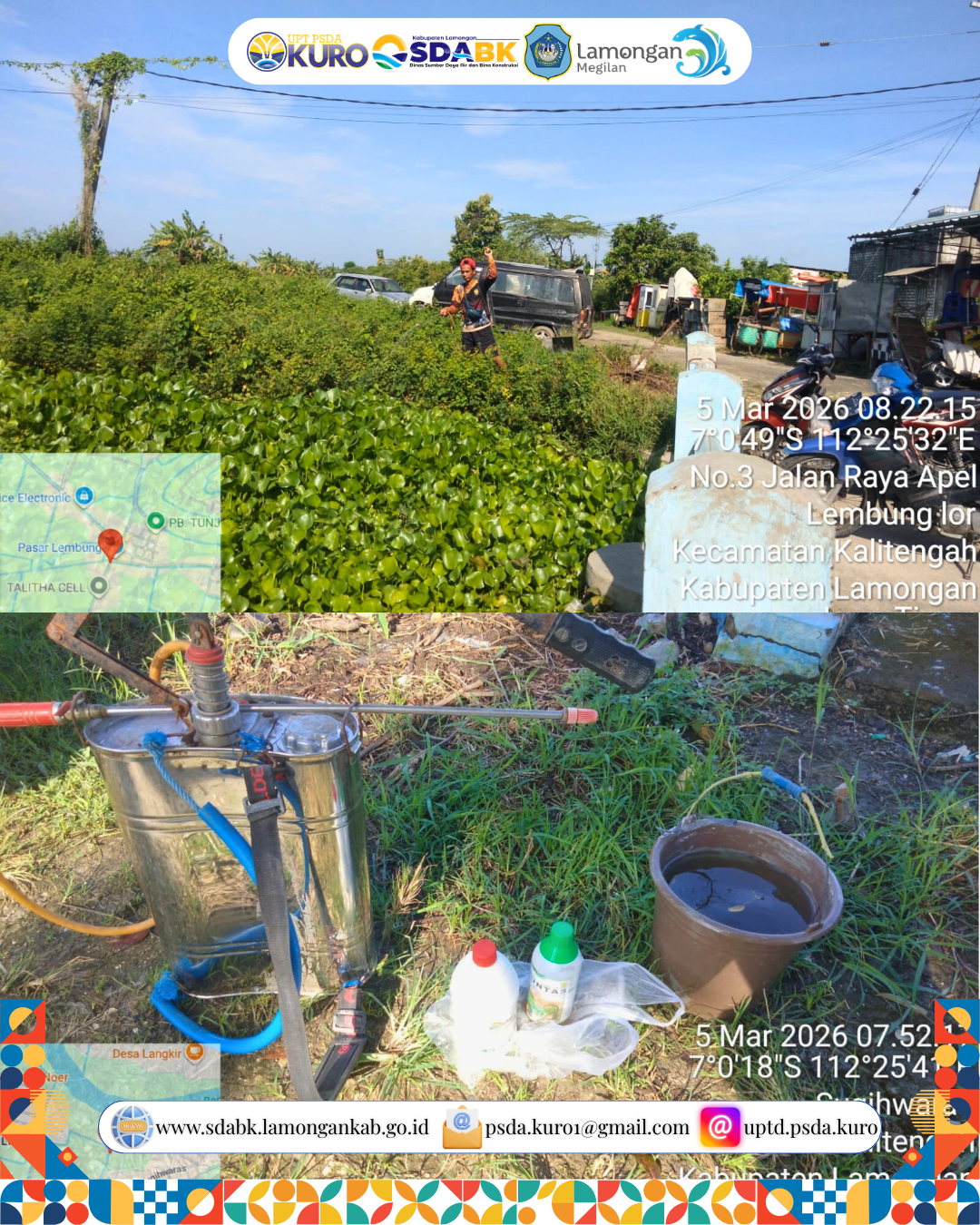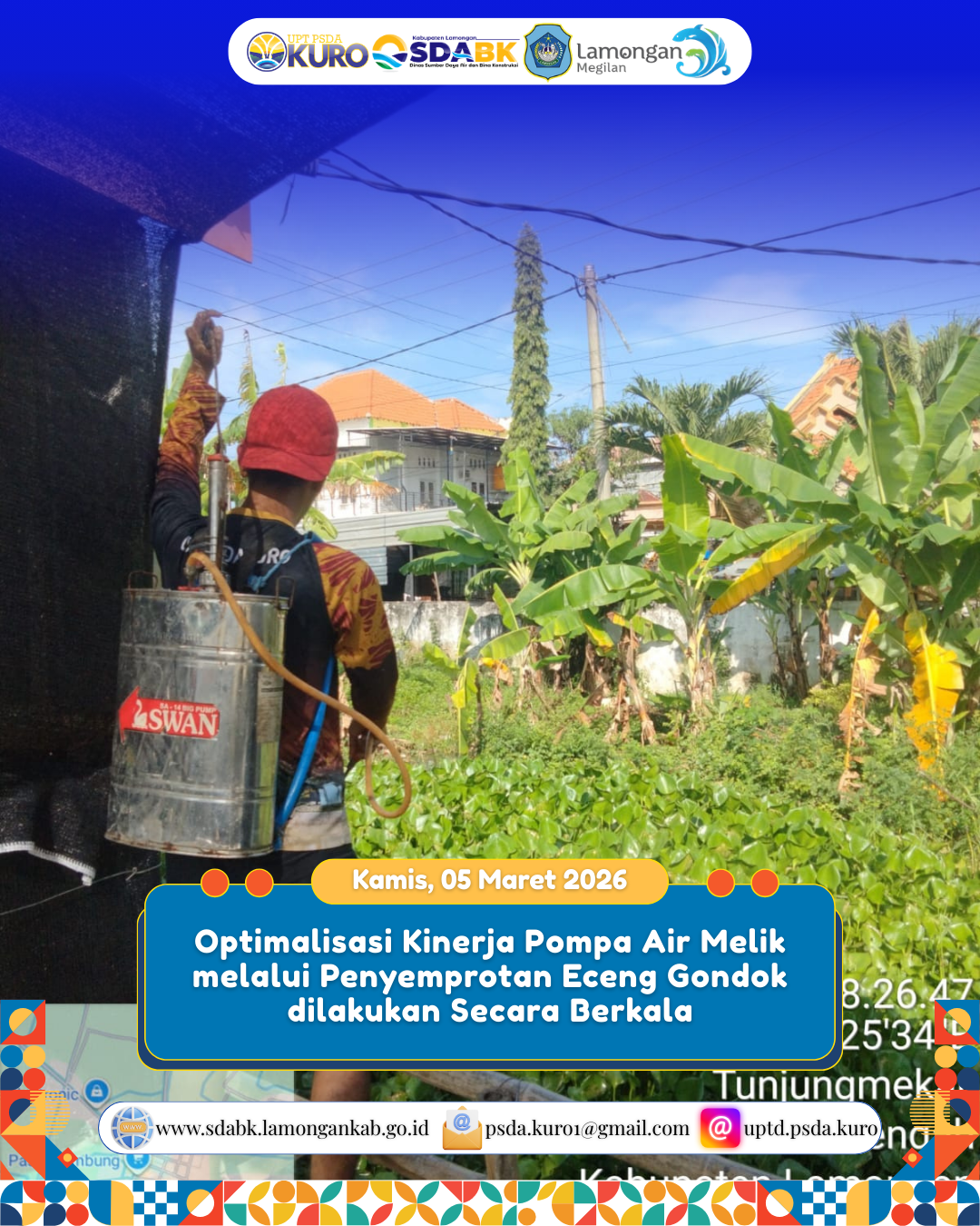 UPTD PSDA Kuro melaksanakan kegiatan penyemprotan eceng gondok secara berkala di sekitar saluran menuju Rumah Pompa Melik sebagai langkah optimalisasi kinerja pompa air. Kegiatan ini bertujuan untuk menjaga kelancaran aliran serta mencegah hambatan yang dapat memengaruhi efektivitas operasional pompa.